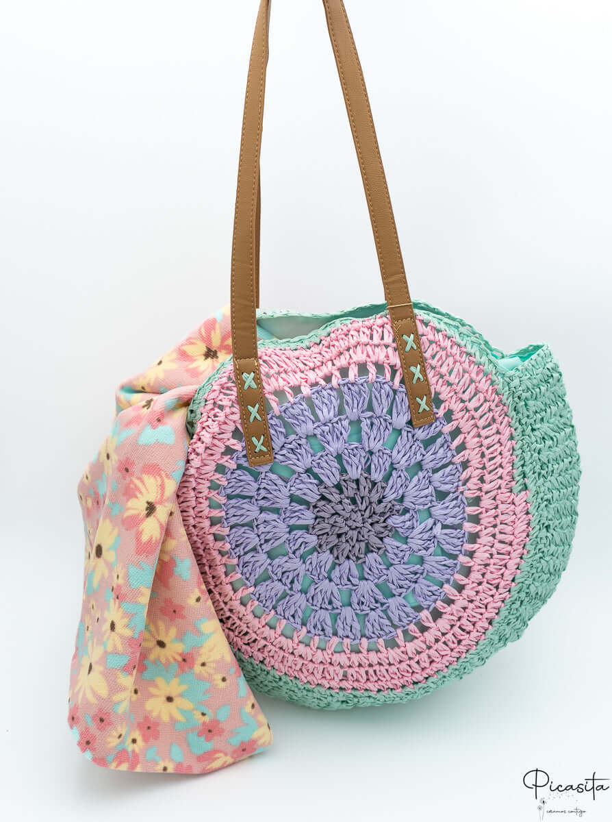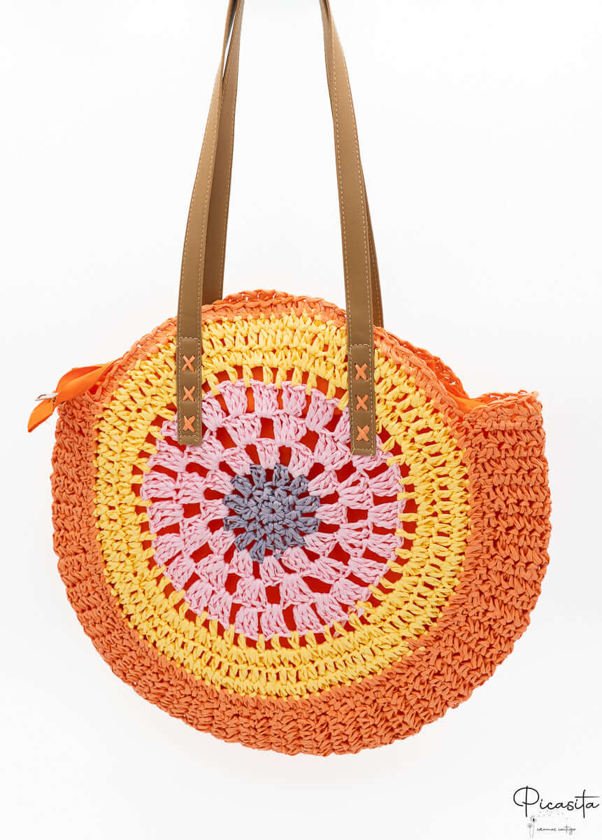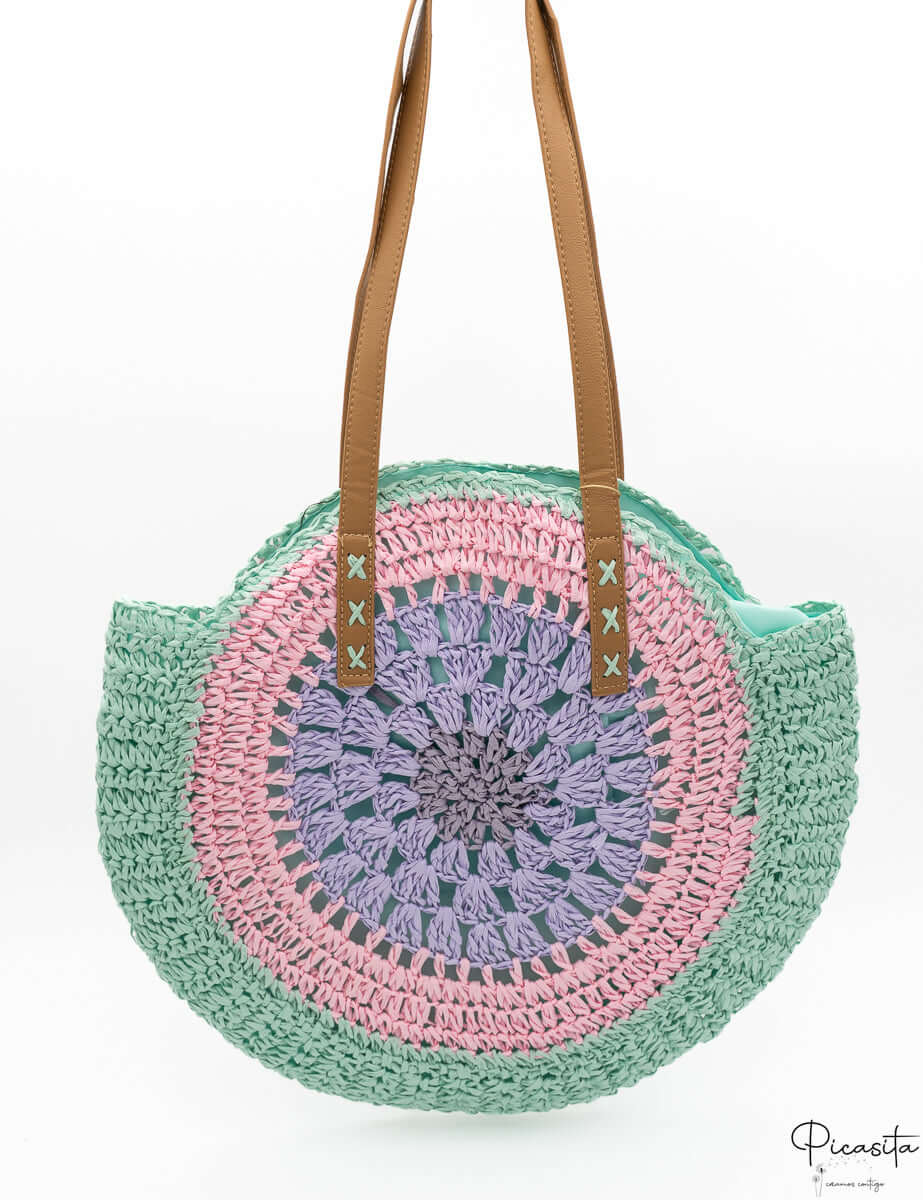 The aesthetic of our zipper beach bag is as captivating as its functionality. Its round shape, made of braided straw, is adorned with a circular pattern of pastel colors that emanate freshness and optimism. Shades like mint green, soft pink, and lilac intertwine harmoniously, creating a zipper beach bag that is a true visual delight.
