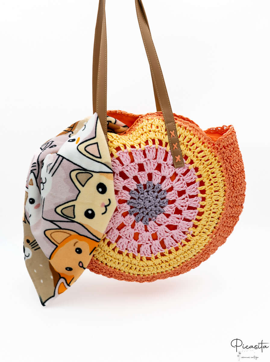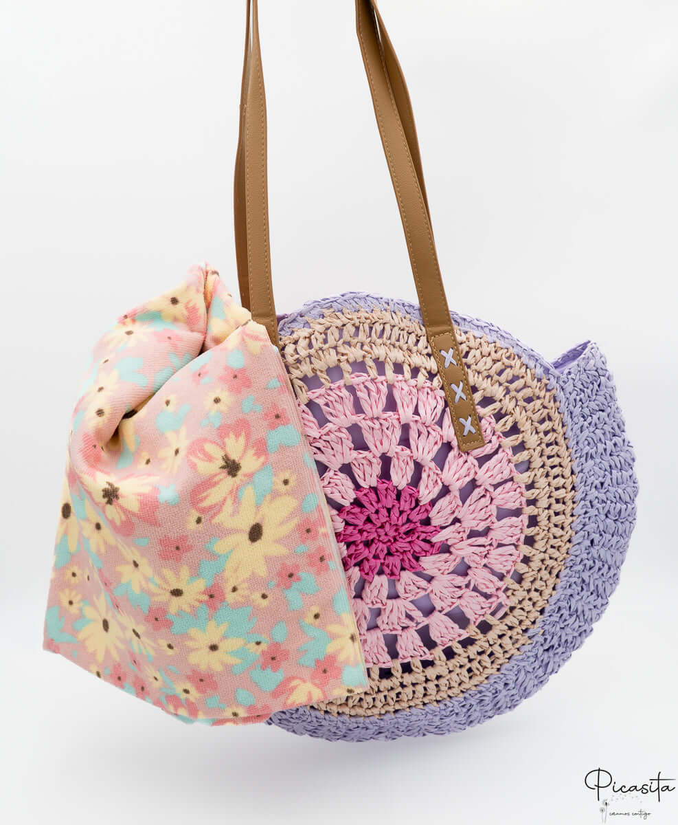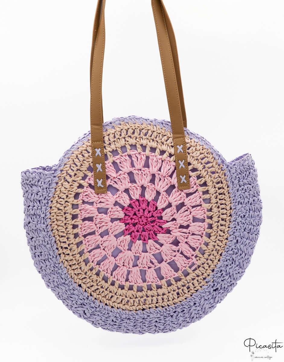The aesthetic of our zipper beach bag is as captivating as its functionality. Its round shape, made of braided straw, is adorned with a circular pattern of pastel colors that emanate freshness and optimism. Shades like mint green, soft pink, and lilac intertwine harmoniously, creating a zipper beach bag that is a true visual delight.