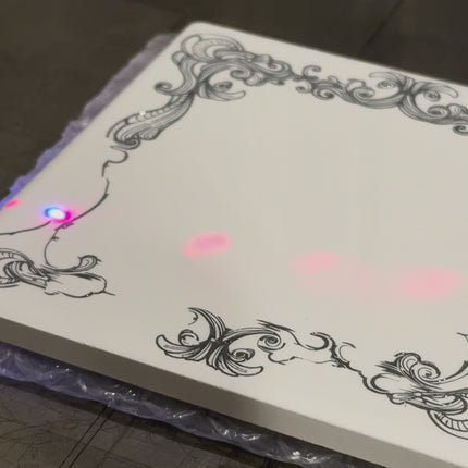 The possibilities are endless! You can engrave texts, names, addresses (as seen in our vintage border examples), and even photographs. The design is rendered with great detail in elegant gray and black tones on the shiny surface.