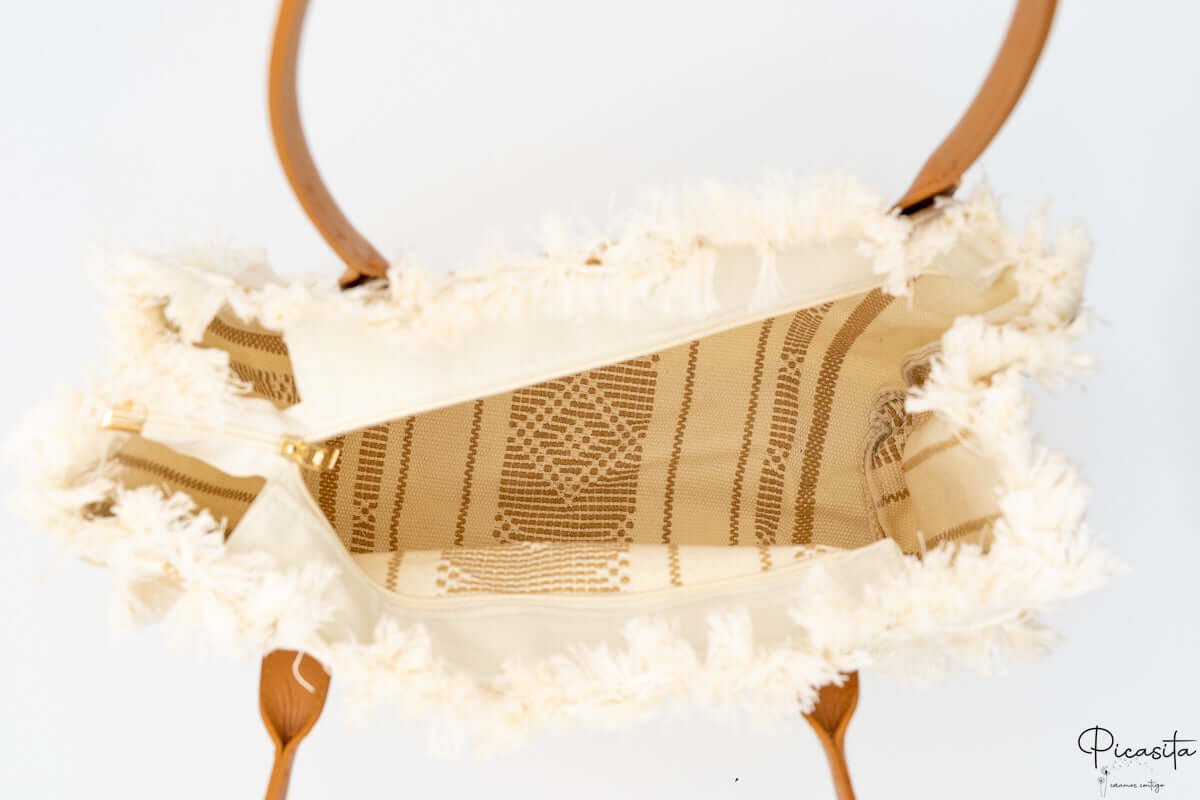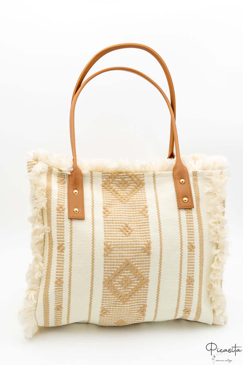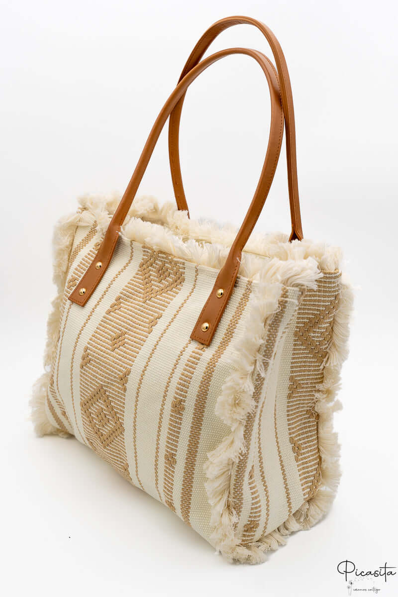 Our cotton beach bag stands out for its material: a dense cotton fabric that gives it superior consistency and durability. The surface features an intricate woven pattern, with motifs that evoke traditional craftsmanship in natural and soft tones, enriched with fringes on the edges that give it a bohemian and relaxed air. It is a cotton beach bag that delights both the eye and the touch.