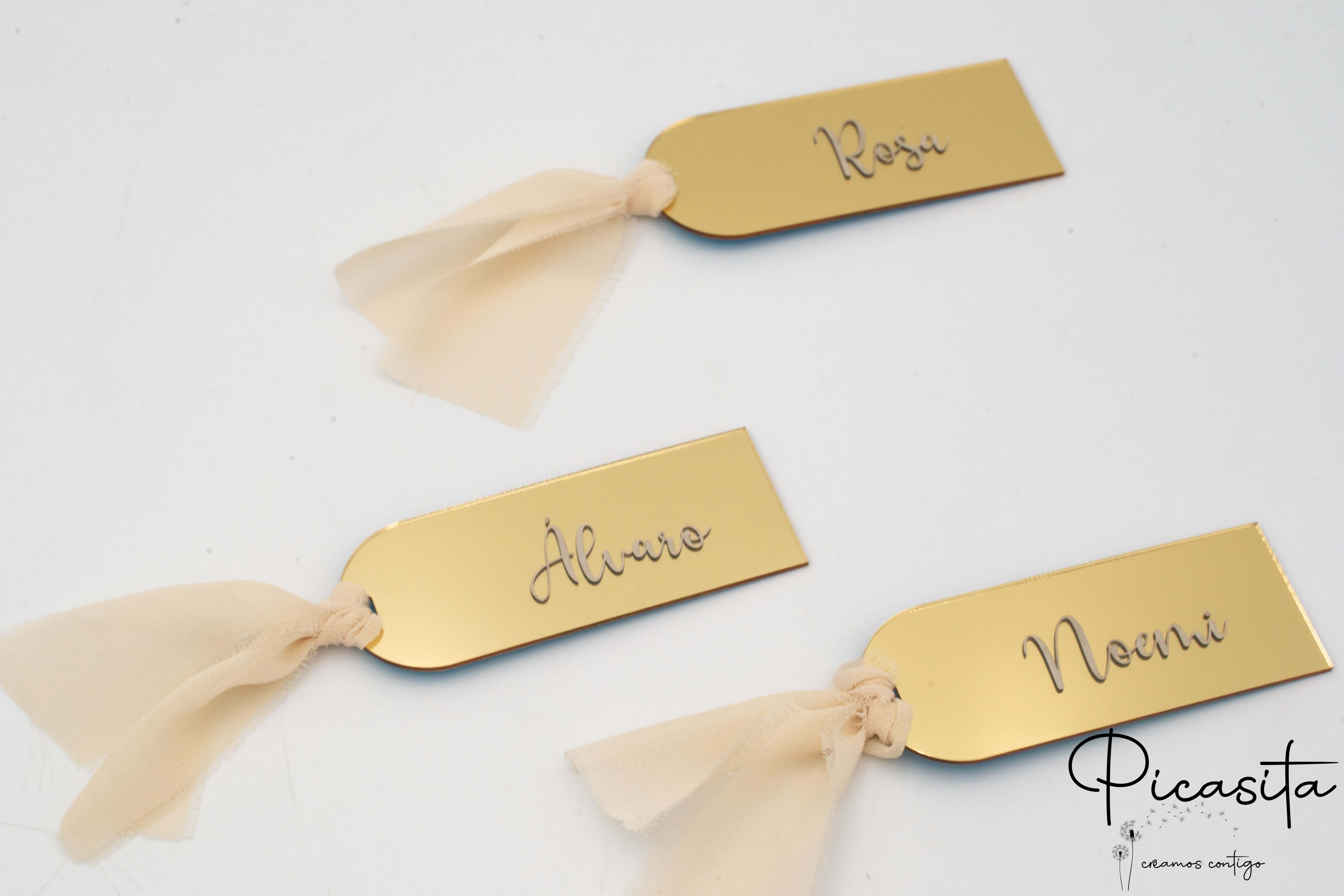 The design of our mirror place cards is carefully crafted to capture ambient light and add a sophisticated shine to your table decor. Made from high-quality rigid methacrylate, this gold place card offers a premium reflective finish that perfectly matches any decorative style, from the most classic and romantic to the most avant-garde. We invite you to explore more ideas in our store to complement the aesthetic of your celebration. The visual combination of the shiny acrylic with the delicate and romantic texture of the chiffon fabric ribbon tied at the end creates a fascinating contrast that will captivate everyone.