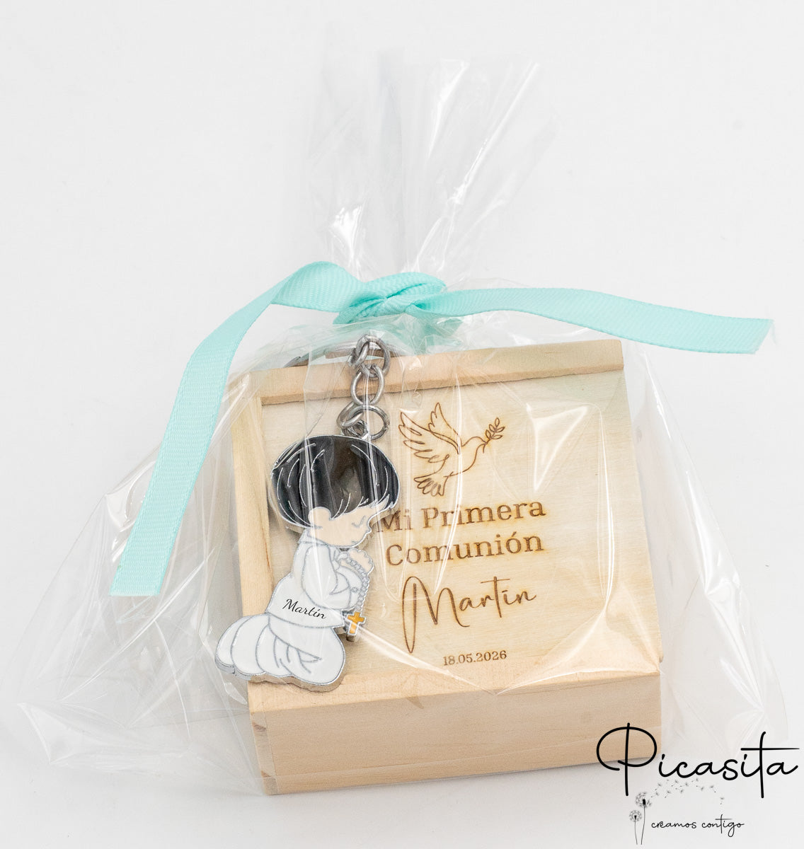Keychain + Tic Tac Toe Game: Presented in a wooden box whose lid we personalize with high-precision laser technology, creating one of the most interactive and lasting communion guest gifts.