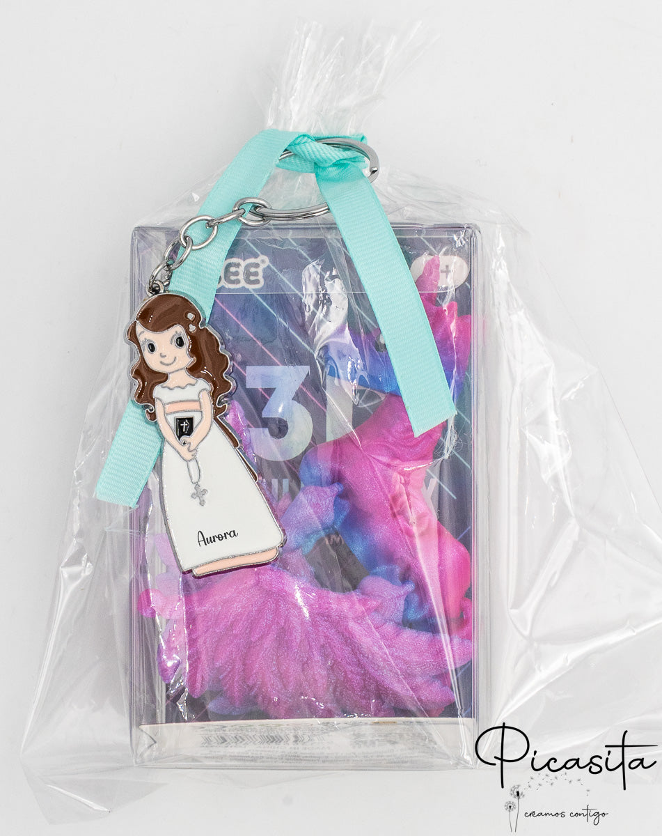 Versatility is the key to our communion gift set. We have carefully selected combinations that balance the tradition of keepsakes with the fun of play. At the heart of many of these options is a beautiful enameled metal keychain featuring a praying boy or girl, a classic and tender symbol. From there, the communion gift bag adapts to your preferences: