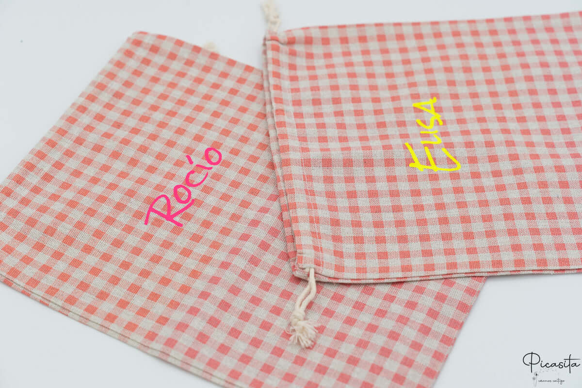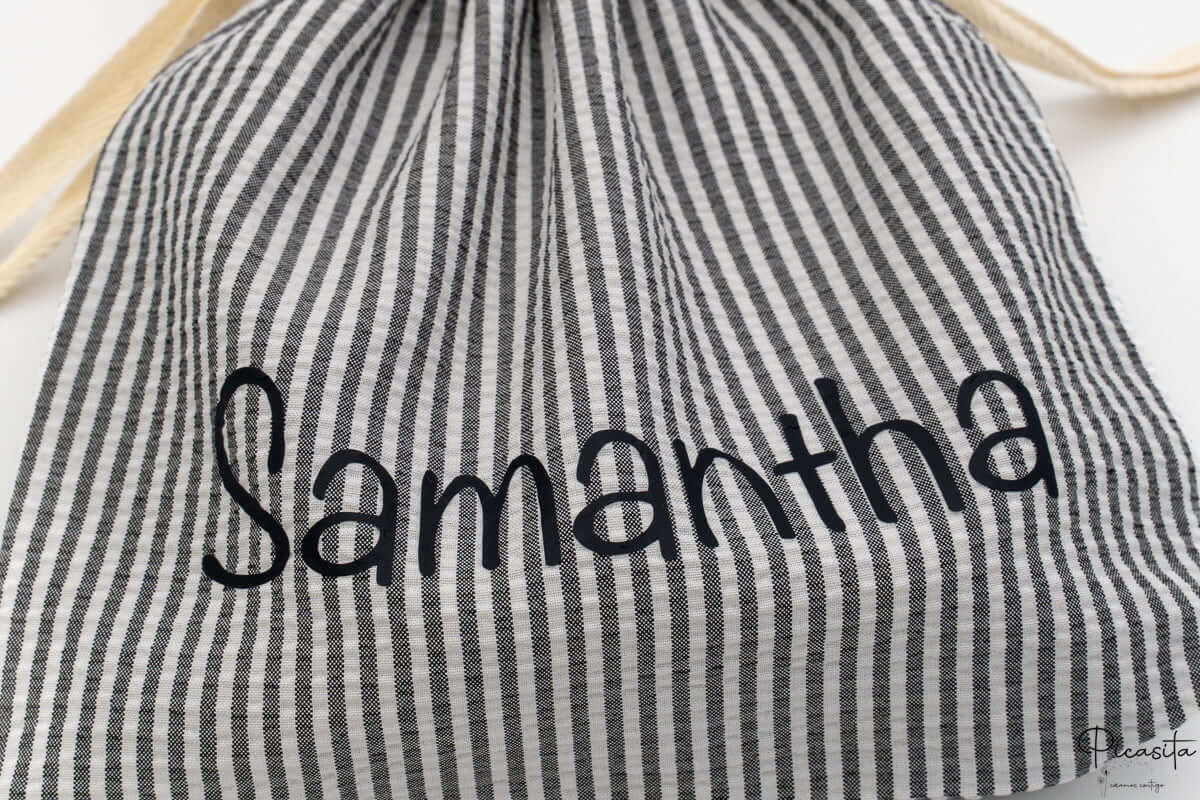 We turn your sack into a personalized bag using high-resistance heat-transfer vinyl. We exclusively use the Noteworthy font for a perfect, durable, and very legible finish.