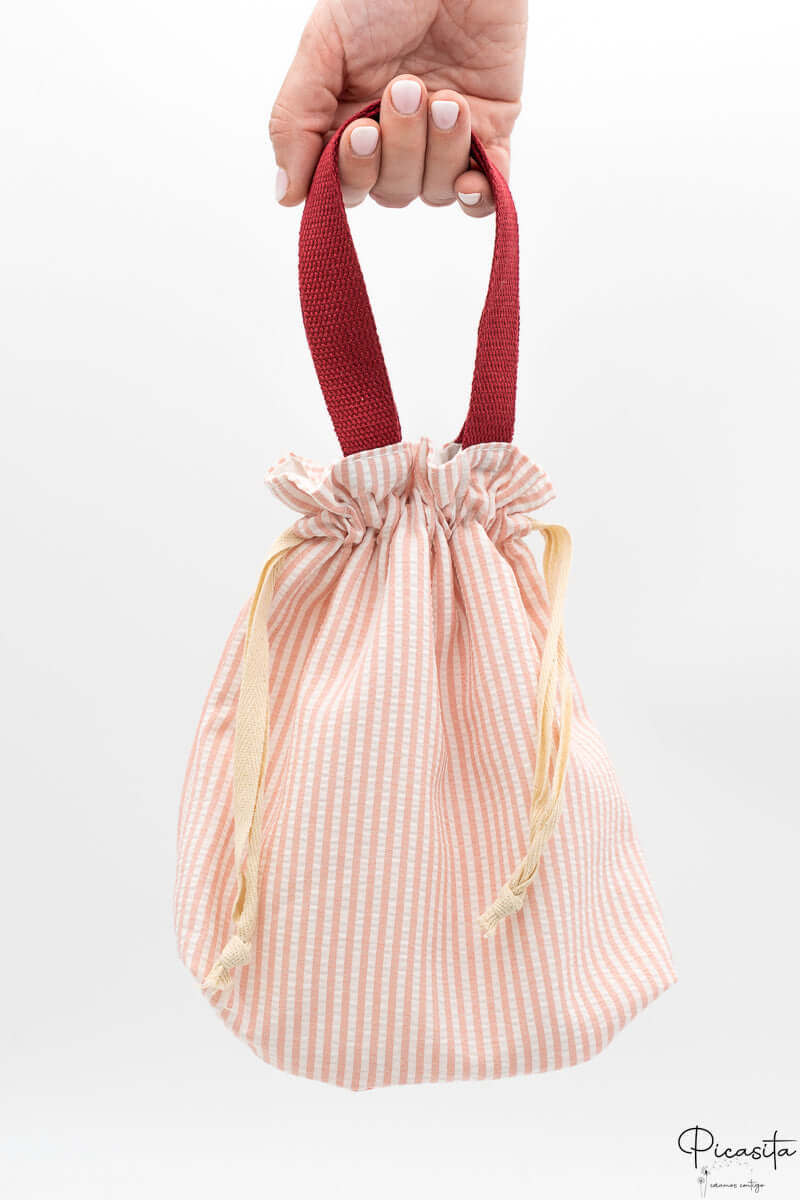 The 'Granate Handle' and 'Mustard Handle' models feature a striped print and include practical top canvas handles. The 'Pink Check' model has a vichy print and classic sack format with a drawstring closure, without top handles.
