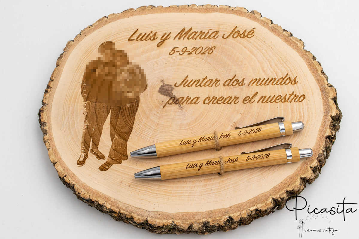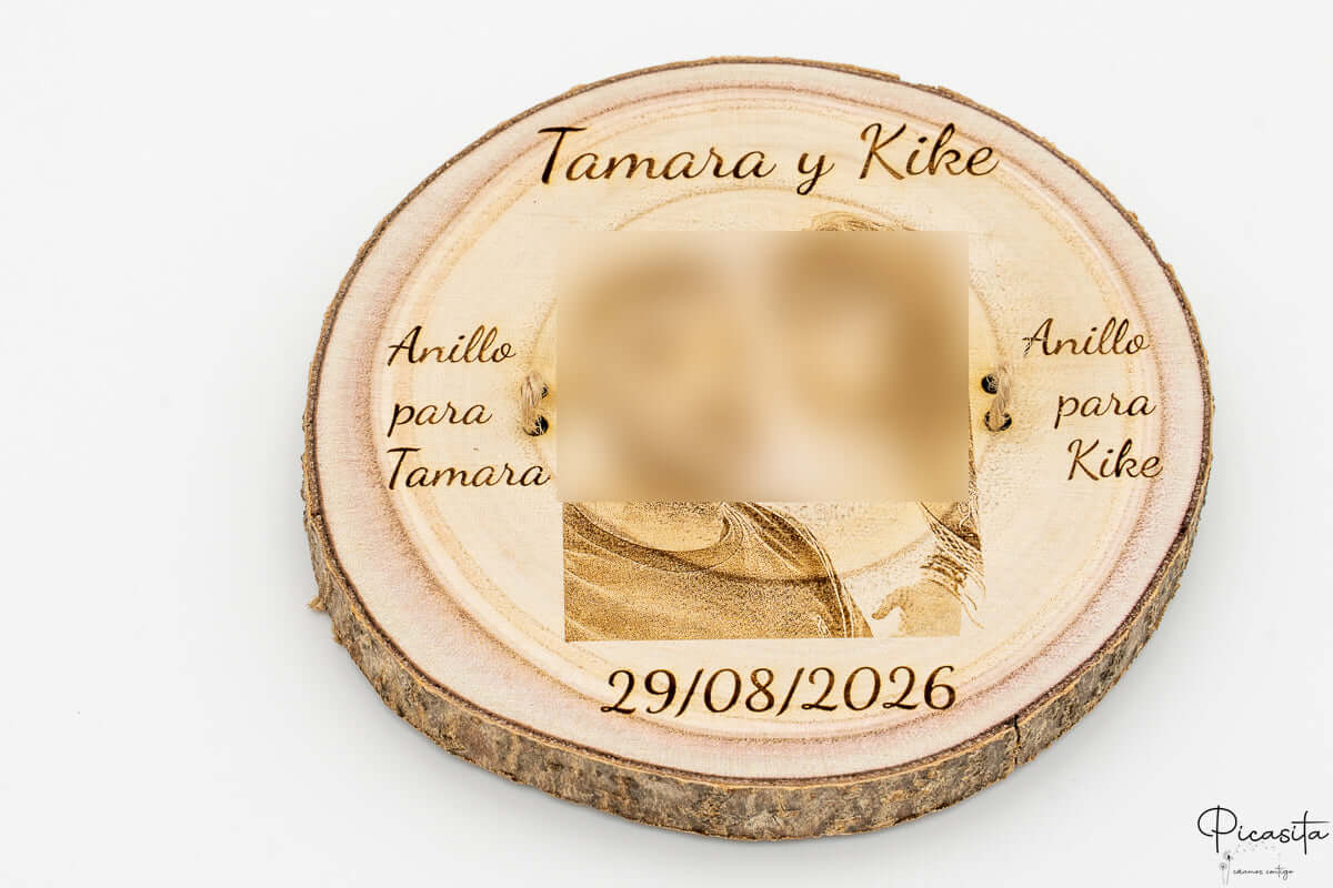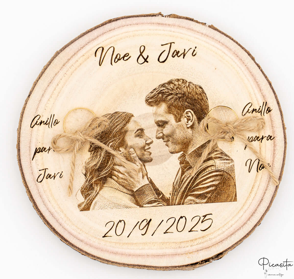 We know that details make the difference. That’s why this engraved ring holder not only serves to carry the rings safely to the altar but also transforms into a piece of emotional art. Thanks to the rustic natural jute cords threaded through the wood, your jewelry will be perfectly secured. Additionally, as a personalized ring holder in its visual essence (available in versions with photo or text only), you can relive the emotion of that day every time you see it decorating your home. The quality of the final result in this ring holder will depend on the sharpness of the original image you provide us.