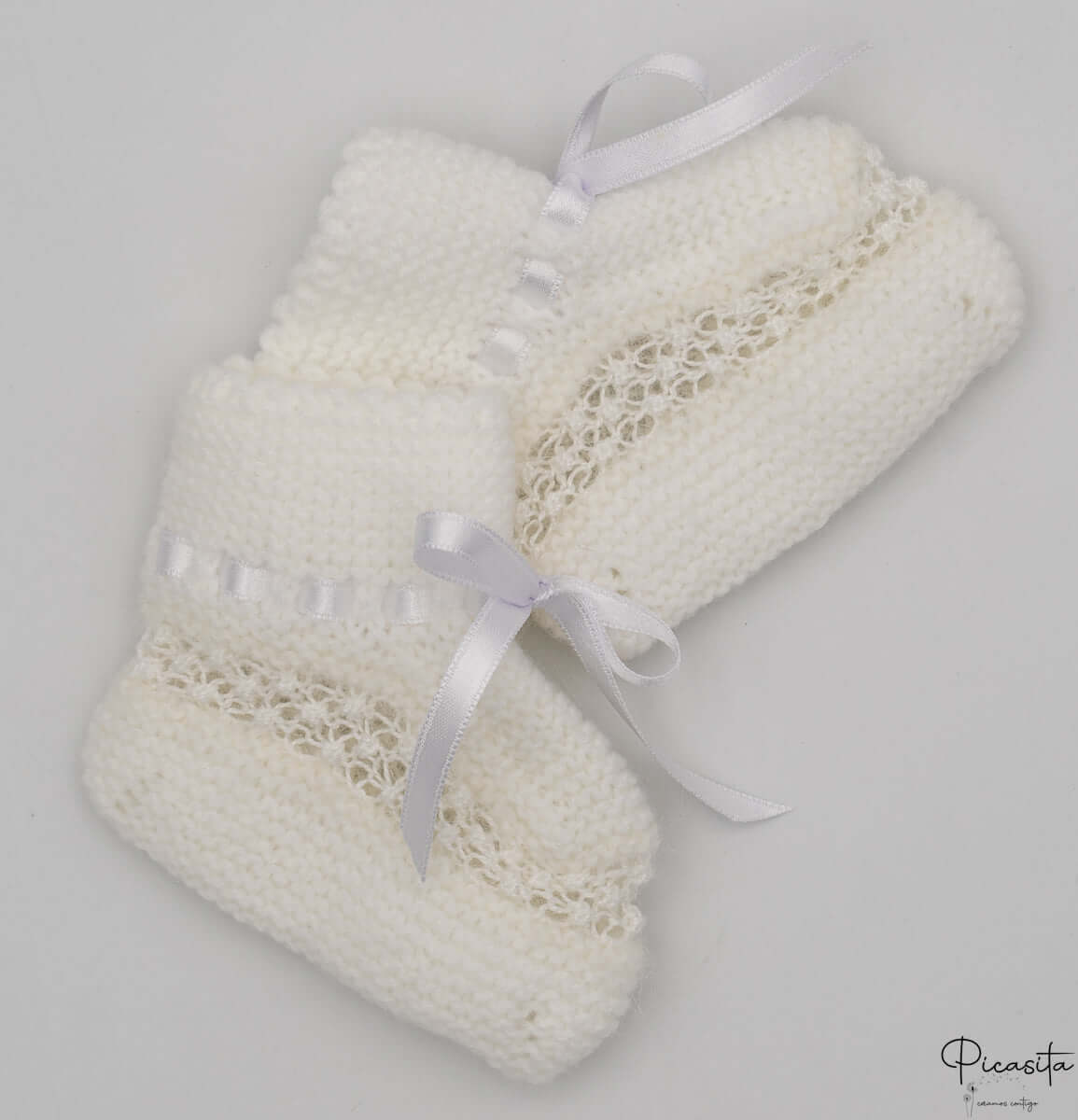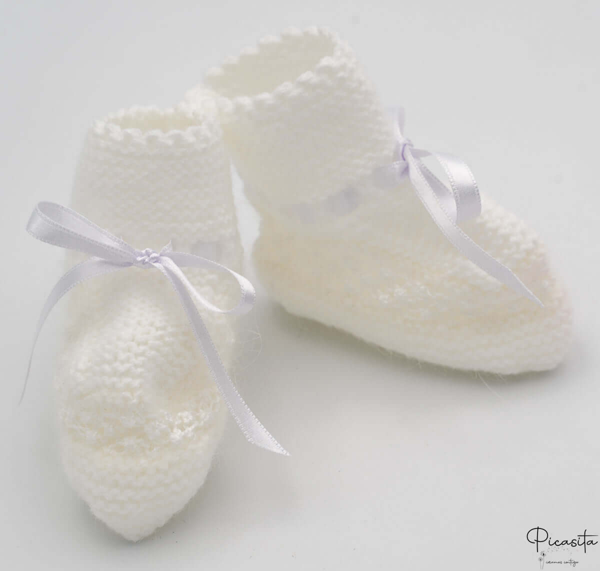 Unlike machine-made footwear, hand knitting allows natural elasticity and ergonomic adaptation that respects foot growth. These newborn booties in size 1 month wrap the foot without squeezing, allowing free movement of the toes. Each tie of the white satin ribbon is a commitment to safety and timeless classic style.