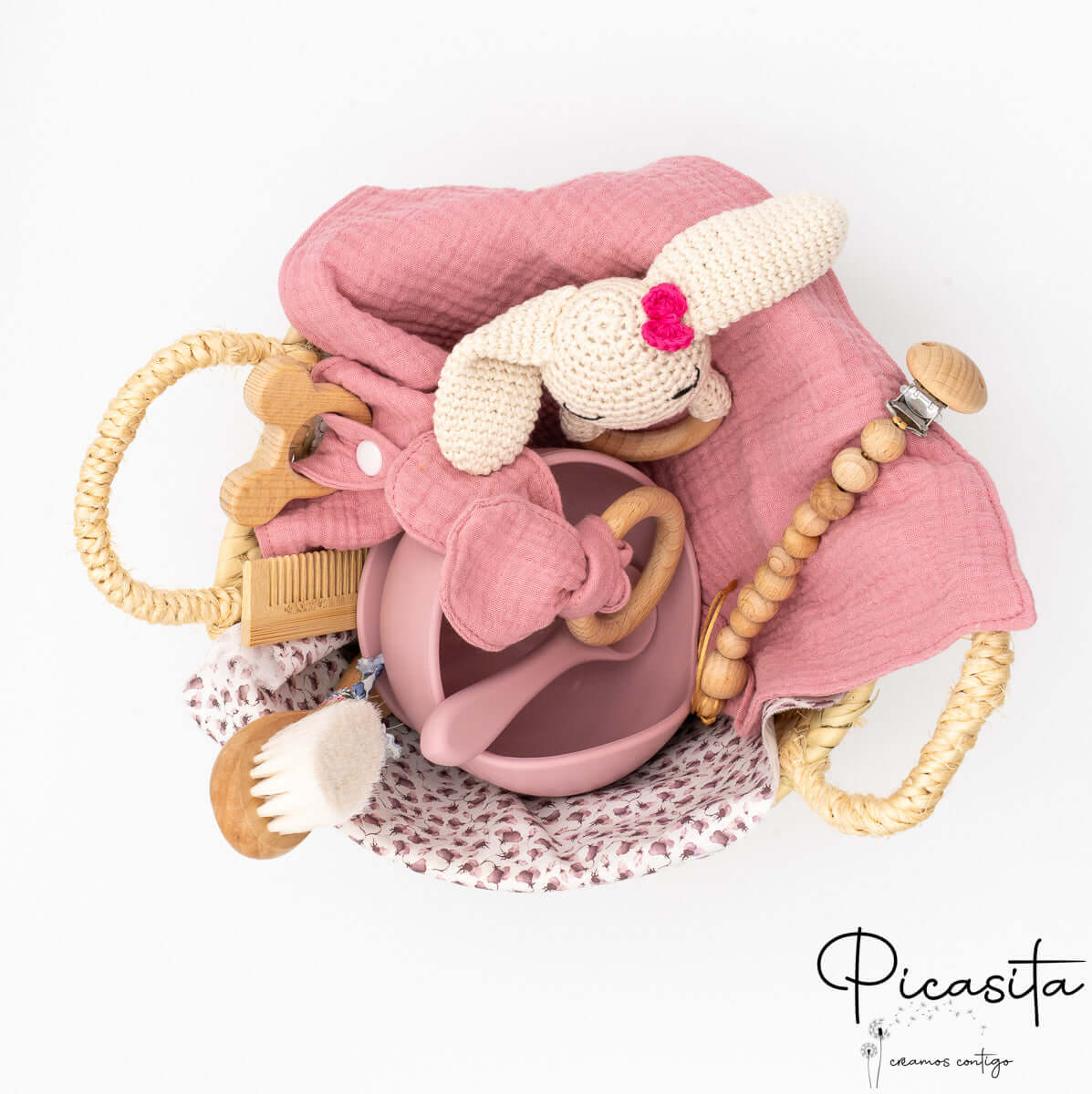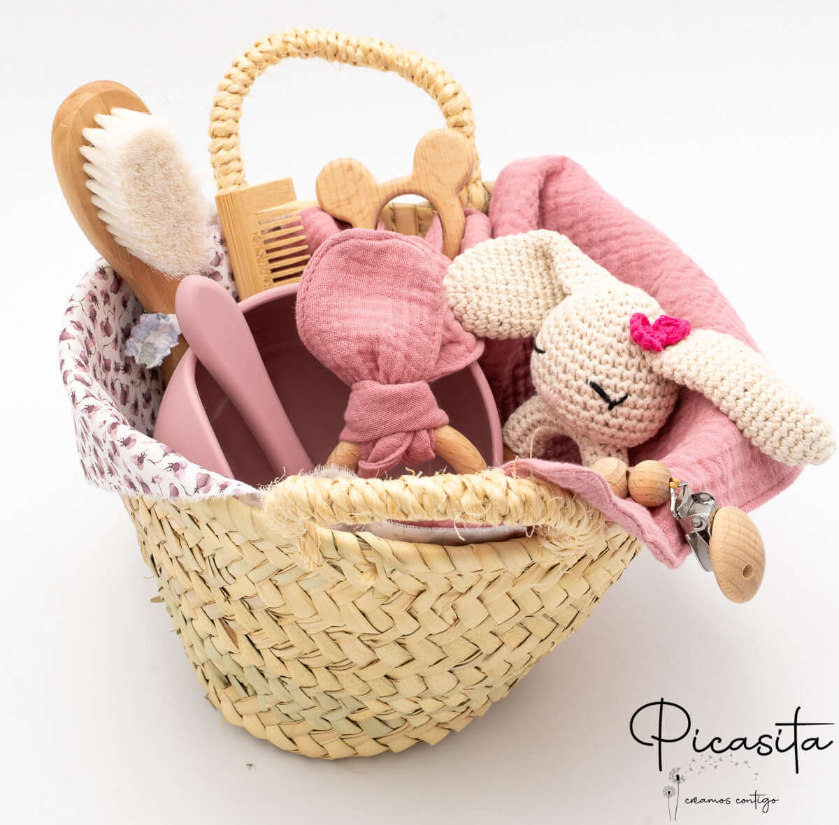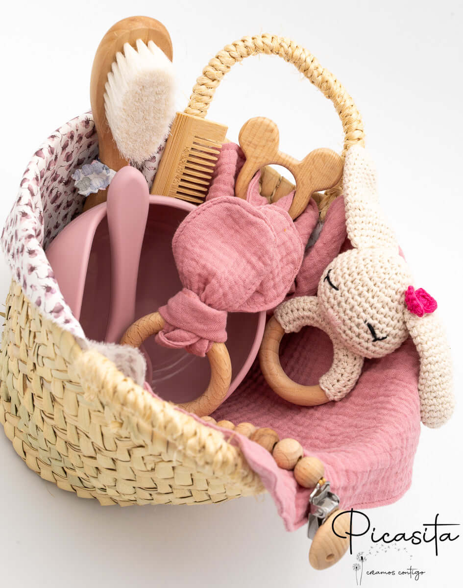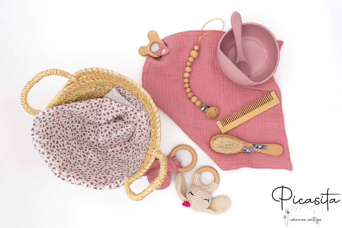 At picasita, we know that the arrival of a baby is a magical event that deserves to be celebrated with truly unforgettable details. That’s why we have designed this beautiful newborn basket, a carefully curated and exquisite selection of childcare items that combine functionality, safety, and an undeniably tender aesthetic. This newborn hamper is meticulously crafted to offer new parents very useful tools for their baby’s daily life, presented in an impeccable, rustic, and natural way.