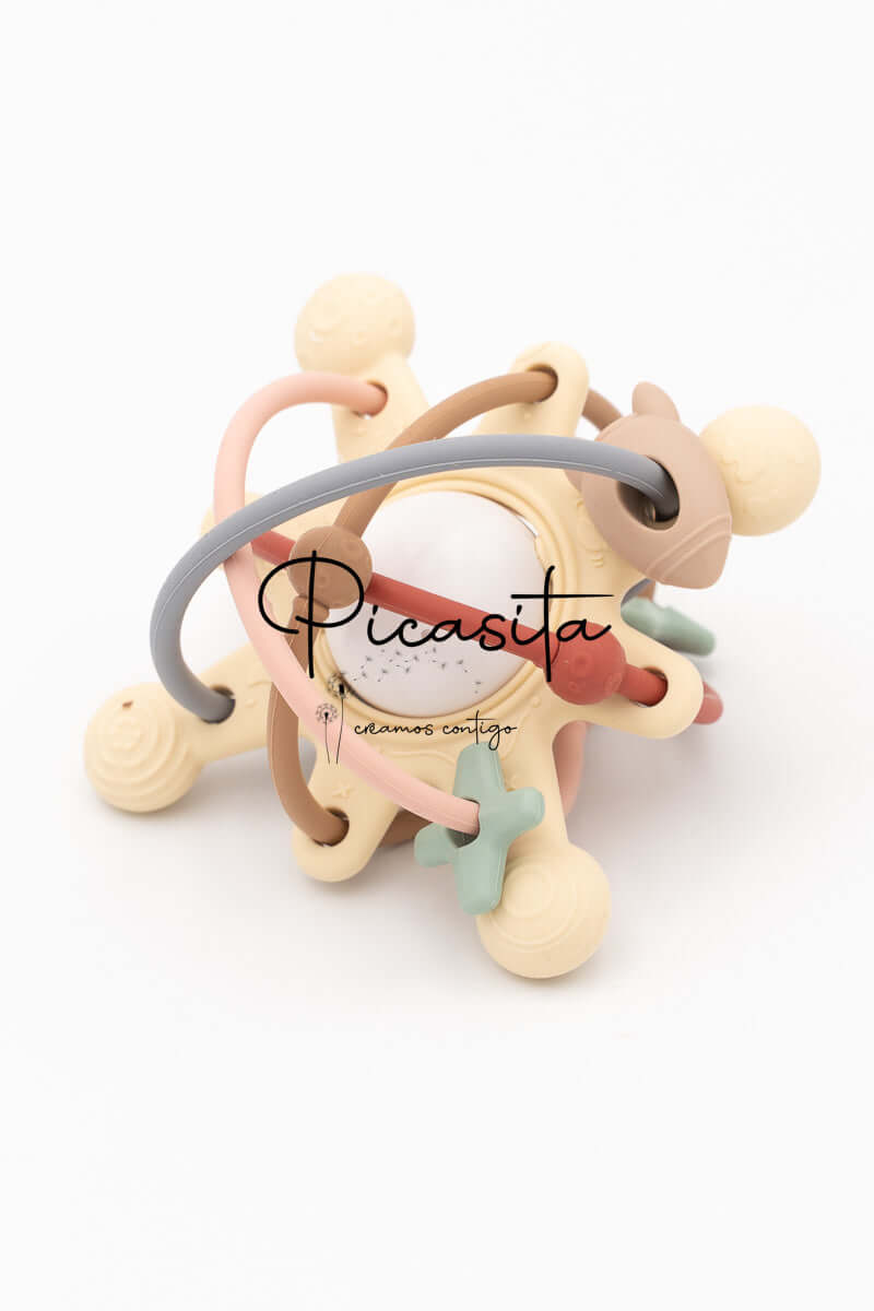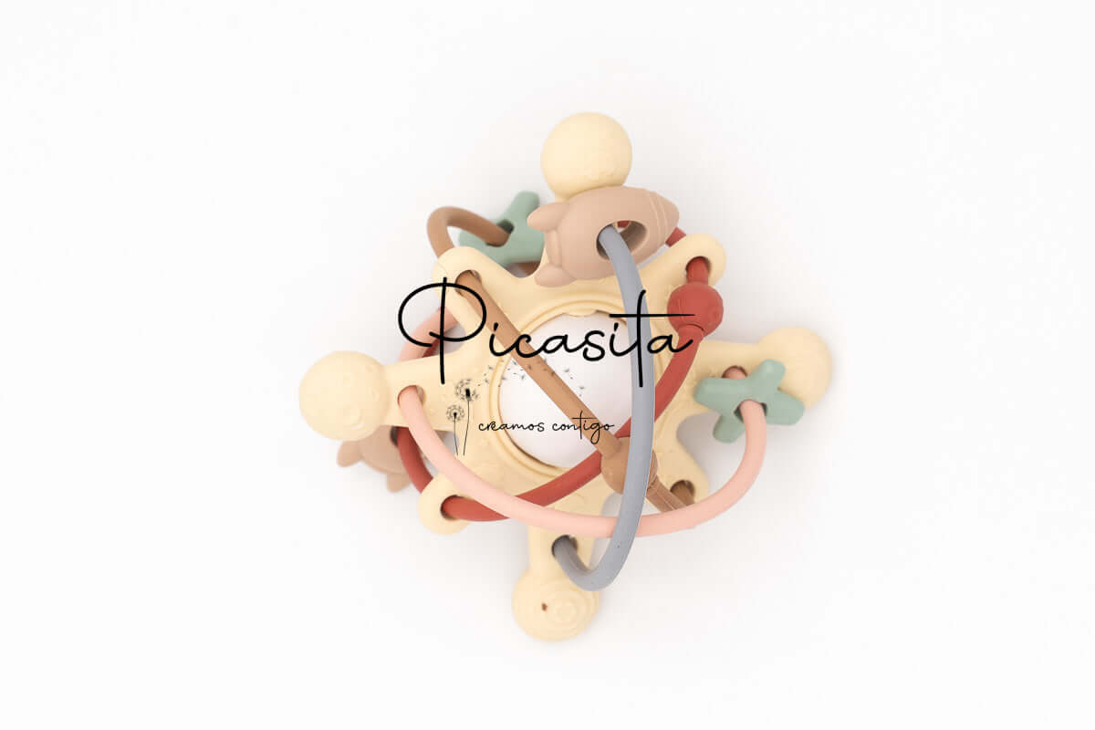 At the heart of this toy is a sturdy white polypropylene sphere that acts as the sound core. Unlike other overly noisy toys on the market, this silicone rattle produces a soft and very pleasant jingle, expertly designed to stimulate the baby’s auditory sense without being harsh or overstimulating for their delicate nervous system. It’s the perfect travel companion; its intertwined ring design allows it to be easily attached to the stroller’s horizontal bar or the pushchair, ensuring hours of entertainment while on the go. At picasita, we make sure to offer you products that truly make your daily life easier; that’s why it’s very easy to clean, even allowing washing in the dishwasher’s top rack, always recommending letting it air dry thoroughly to keep its interior spotless.
