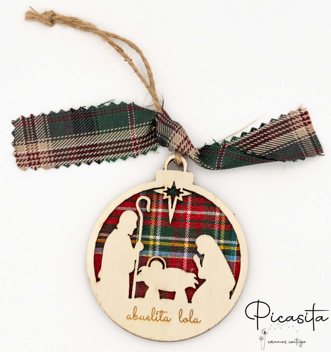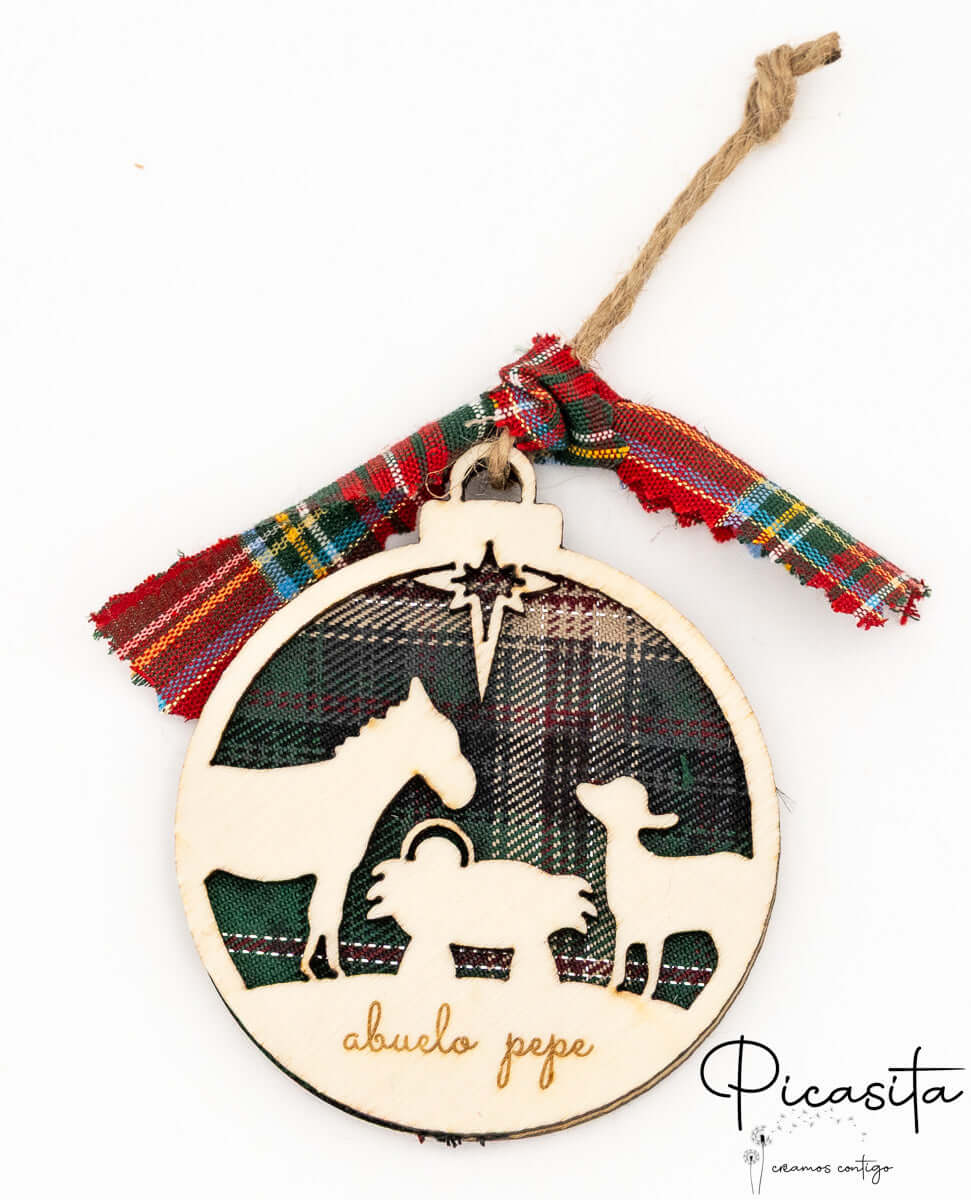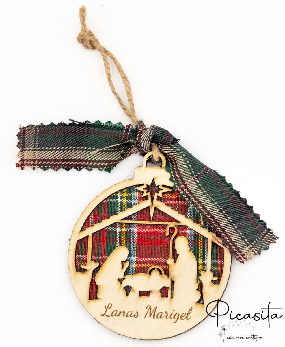 Our personalized Christmas baubles stand out for their innovative three-dimensional design. They are carefully made by layering three pieces: two sturdy natural plywood pieces framing a warm central layer of Scottish plaid fabric. This contrast of textures highlights the die-cut silhouettes, creating a fascinating depth effect. You can choose between vibrant red plaid backgrounds or elegant green plaid, always accompanied by a matching bow and a rustic jute cord perfect for hanging on your tree branches.