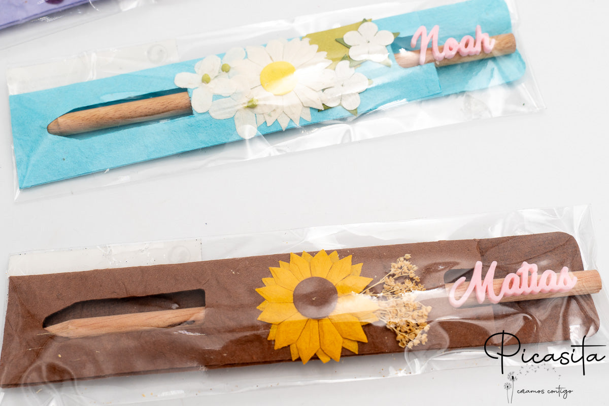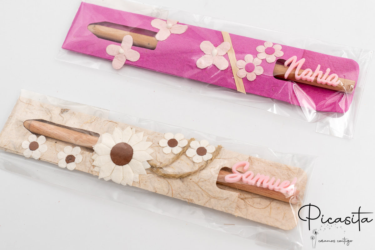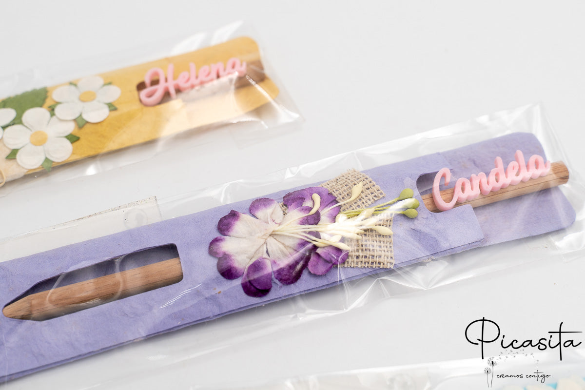 Set of 6 natural wood pencils presented in individual colored sleeves decorated with floral motifs. Each pencil includes the guest's name made using 3D printing technology, making it a unique and personal detail. Specially designed for events and celebrations, these pencils combine the warmth of wood with a handcrafted and colorful presentation.
