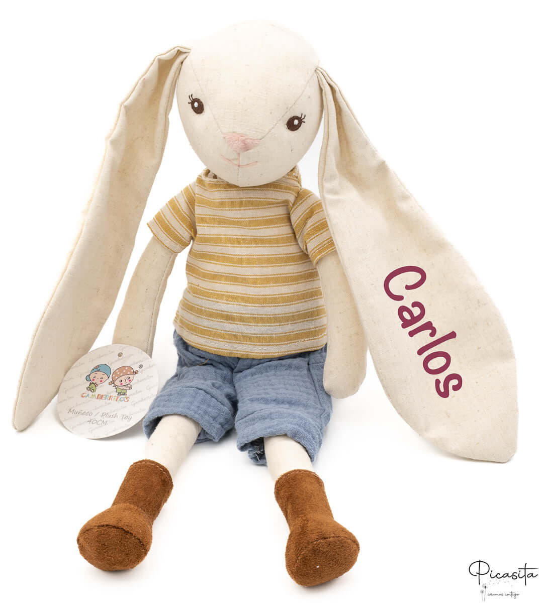 We personalize one of the bunny doll’s long ears with the child’s name using high-resistance textile vinyl. This method guarantees a sharp, durable, and very elegant finish, turning the plush into an unforgettable keepsake.