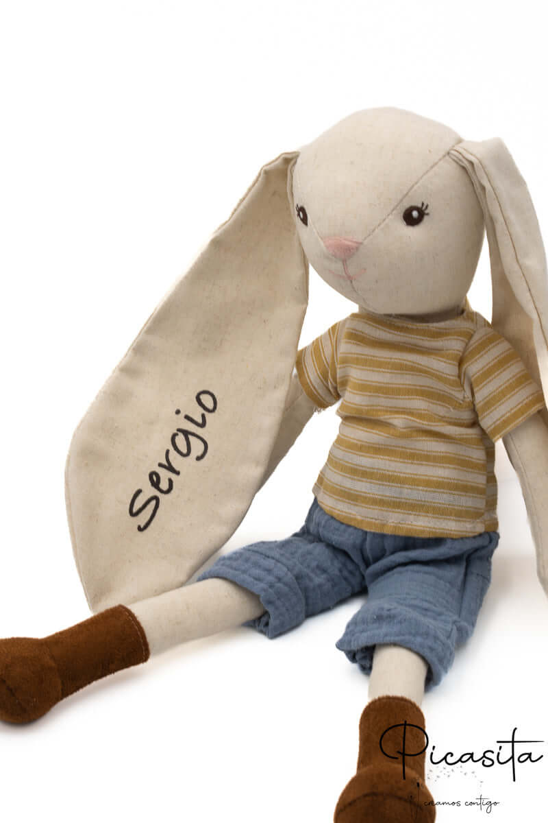 Notice every detail of this beautiful bunny doll. Made with a careful selection of skin-friendly fabrics, it features a natural beige-toned body with distinctive long ears, perfect for little hands to grasp easily. Its outfit gives it a unique and very sweet personality: a cute mustard-striped t-shirt, blue gauze-like shorts, and soft brown booties. Additionally, safety is our top priority: all the facial features of the bunny doll, such as its expressive eyes and pink nose, are meticulously embroidered, completely eliminating any risk of loose small parts.
