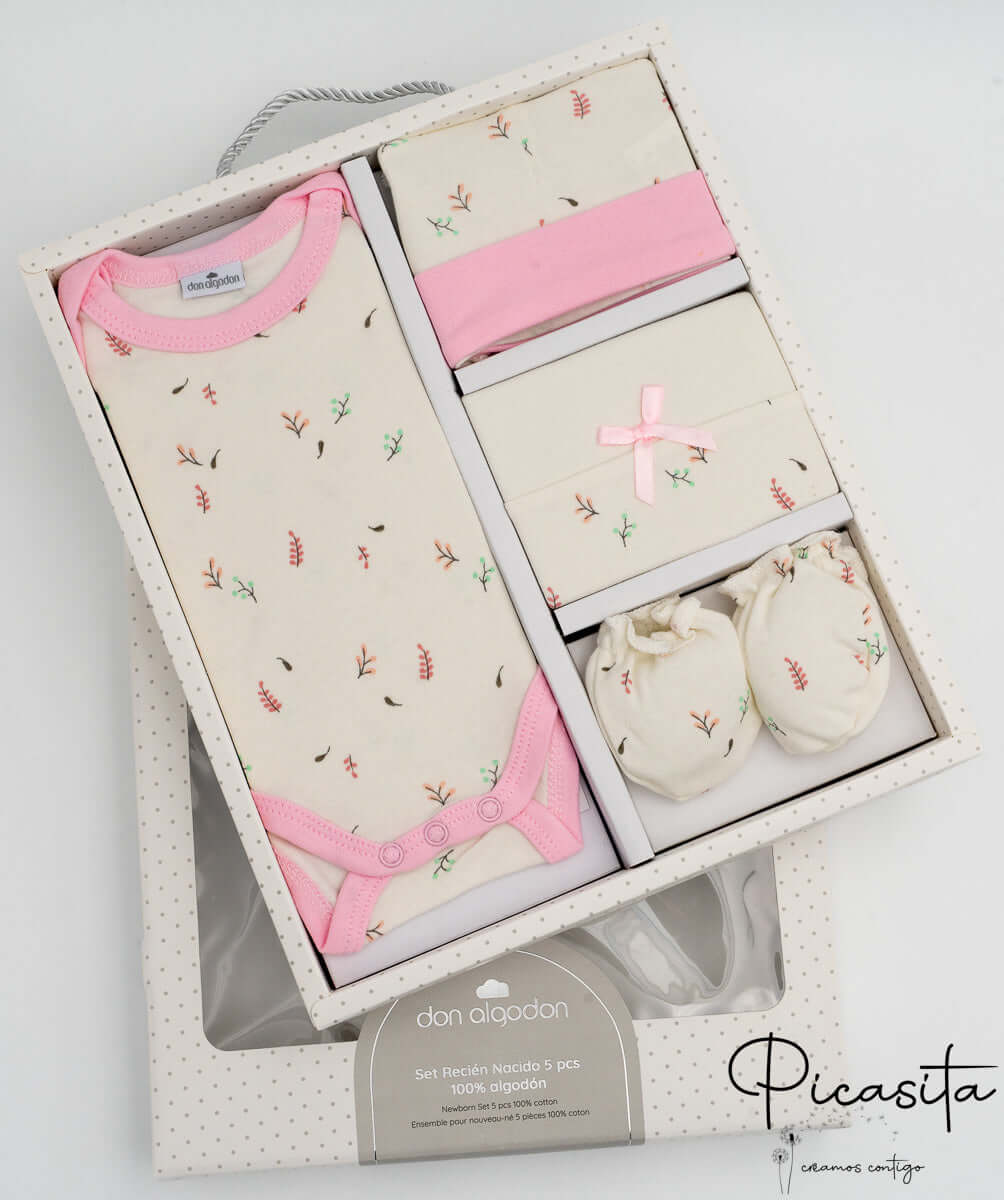 This complete 5-piece newborn set includes a long-sleeve bodysuit, a hat, a bib with a bow, scratch mittens, and a soft swaddle, all presented in a beautiful Don Algodon gift box.