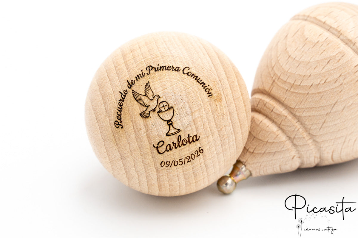 Cada peonza personalizada de nuestro catálogo en picasita está fabricada en resistente madera de haya. Hemos diseñado este modelo específicamente sin bombín en la parte superior para ofrecer una superficie amplia y lisa, ideal para el grabado. Al ser una peonza regalo comunion, la durabilidad es clave: la personalización se realiza mediante grabado láser de alta precisión. Esta técnica quema la madera, dejando un acabado elegante en tonos negros o marrón oscuro que no se borra con el uso, a diferencia de las pegatinas o tintas superficiales. Ten en cuenta que al ser láser, el diseño no tiene color, sino el tono natural del quemado de la madera.