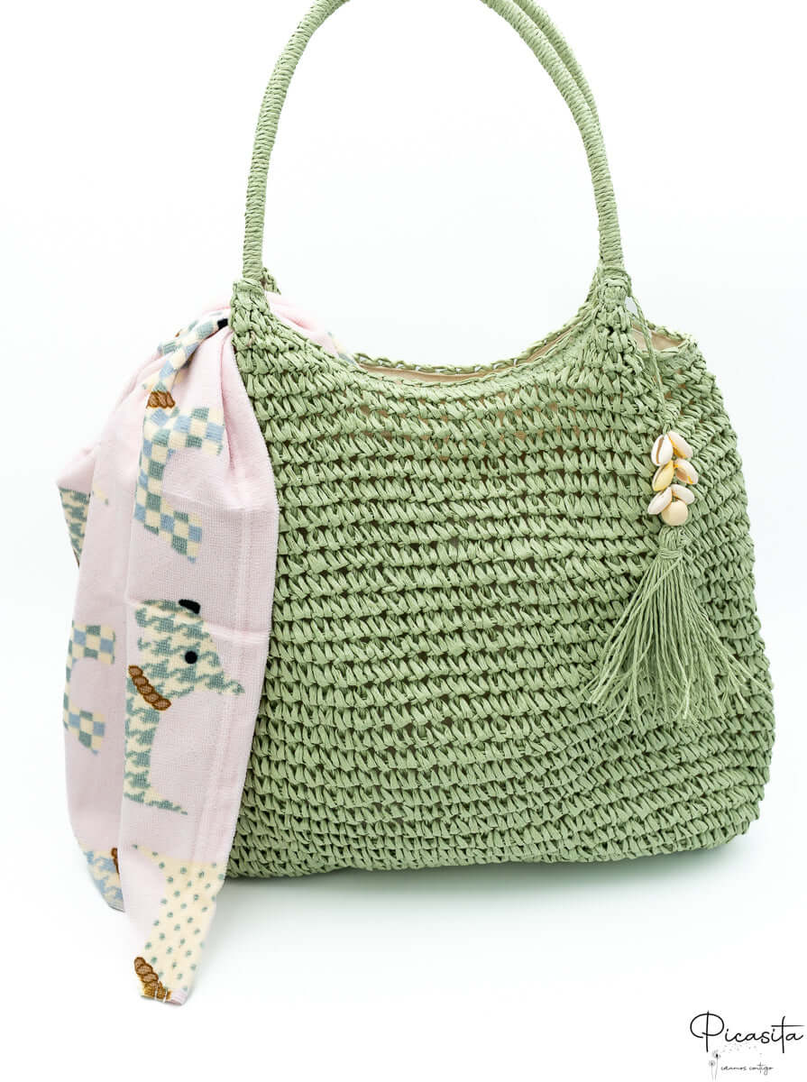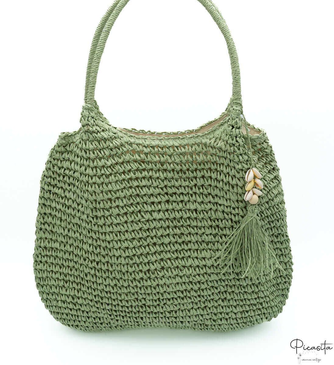 The details make the difference: some models incorporate integrated braided handles, while others feature elegant flat synthetic leather handles, often with decorative stitching. The colors range from natural and neutral tones to olive green, and even vibrant color patterns in some of our designs. Additionally, many of our straw bags include decorative elements such as fiber tassels or seashells, adding a distinctive touch.