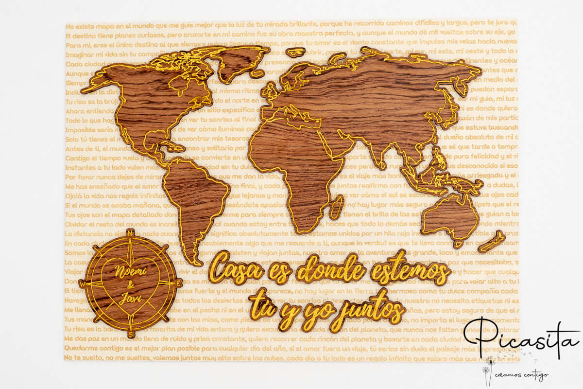 Carefully crafted in our workshop, this piece features a light wood base where we laser engrave romantic background phrases that wrap the piece in a nostalgic and warm aura. On top, a stunning world map cut from dark walnut plywood creates an unmatched 3D effect. The Valentine’s Day engraving of your names is done with high-precision laser technology on the central heart-shaped compass, ensuring a permanent, elegant, and deep finish. To crown the work, we highlight these laser details with hand-applied gold paint, adding a touch of exclusivity and artisanal luxury.