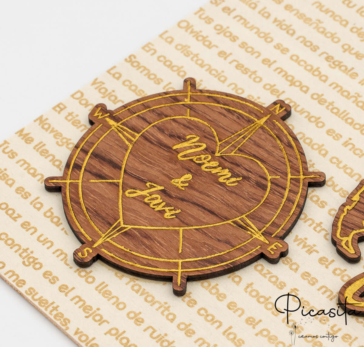 The personalization includes your names laser engraved inside the heart-shaped compass, which is delicately hand-painted in golden tones to stand out against the walnut wood.